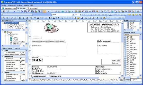 Graphischer Formular und Listgenerator: Mit diesem Werkzeug werden alle Belegdrucke und Auswertung erstell und können vom Kunden selbst angepasst oder neu erstellt werden. |
